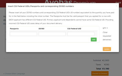 Ayobos premiumサービスの利用にはビザ申請料金に加え3,190円の追加料金がかかります。このサービスを利用する場合、面接を予約する際に使用したクレジットカードでの支払いが必要です*1。この3,190円は1人につき請求される追加料金です。私の場合、家族3人なので、9,570円の追加料金を要求されます。高すぎです。。